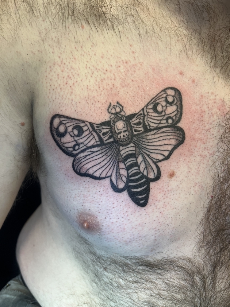 Tatouage du sphinx à tête de mort ou Acherontia atropos, papillon en noir tatoué sur Angoumé.