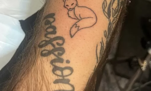 Tatouage animal (renardeau) en lignes fines et l’écriture « passion » cicatrisée (sans retouche) sur Saint-Martin-de-Seignanx.